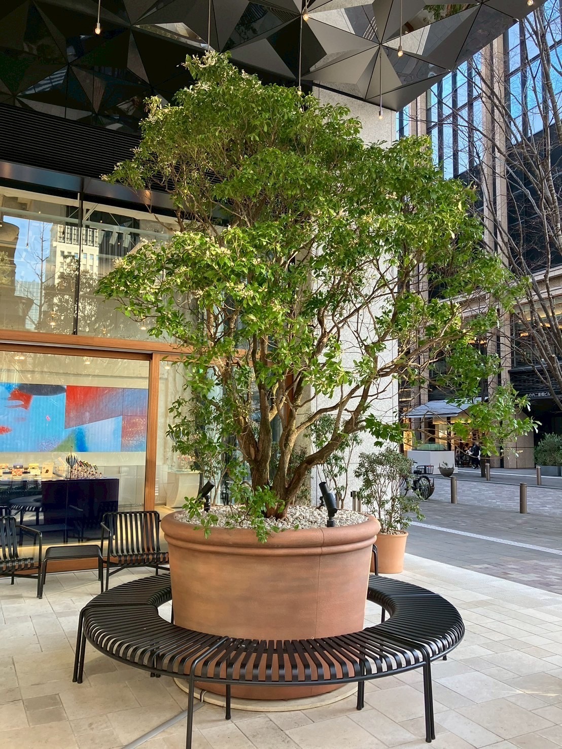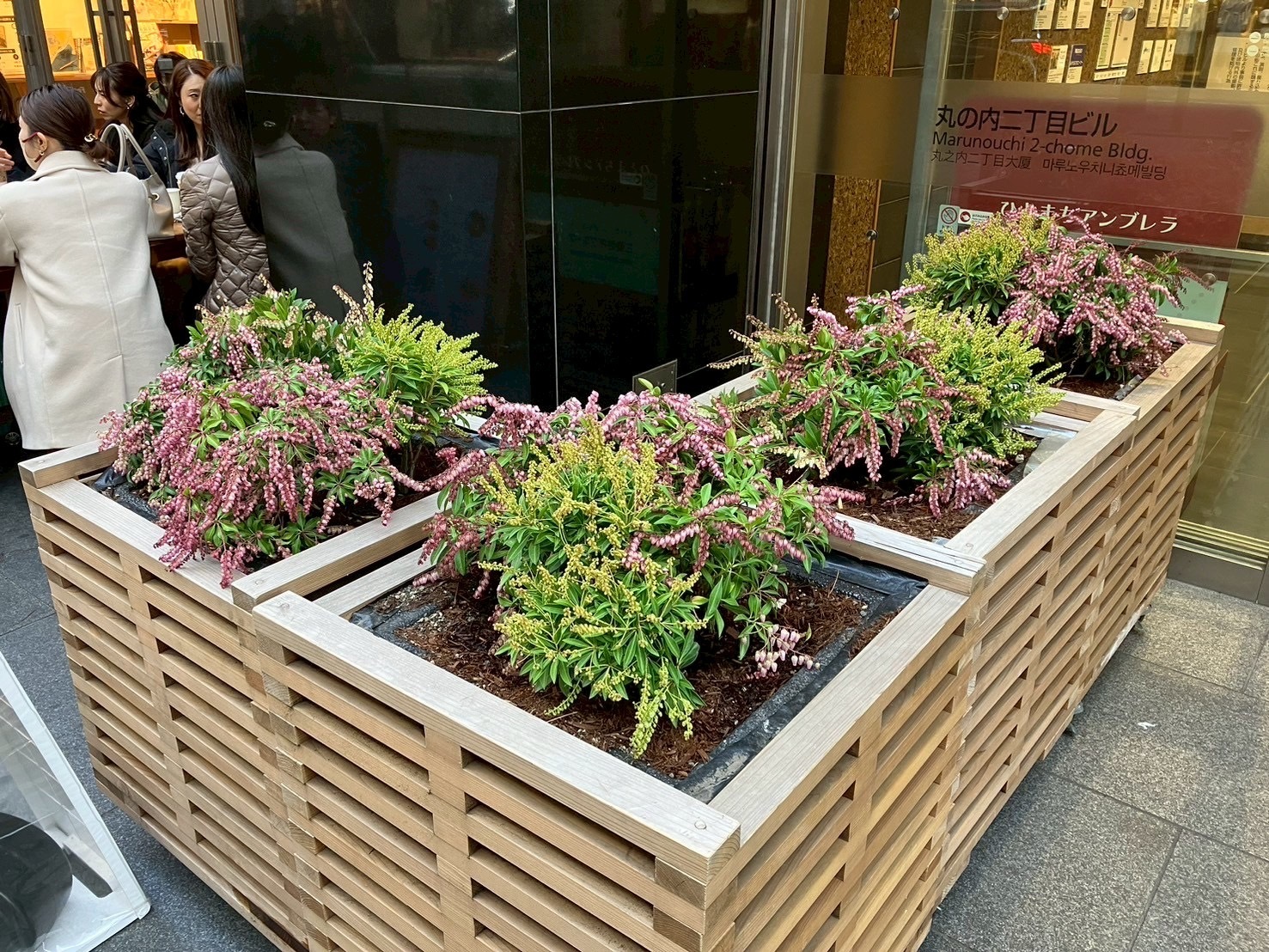 *三菱ビル・丸の内二丁目ビルさんの歩いてすぐ近く、メゾンカカオ旗艦店・丸の内仲通り店の前にも大きいアセビを設置しています。