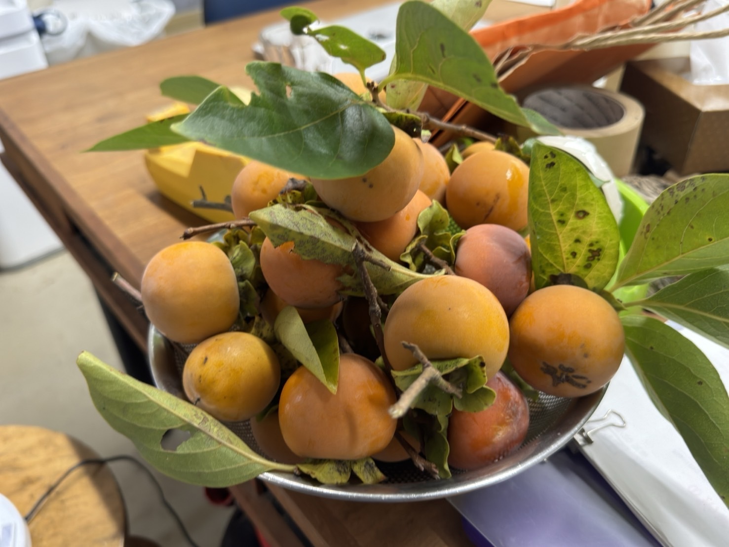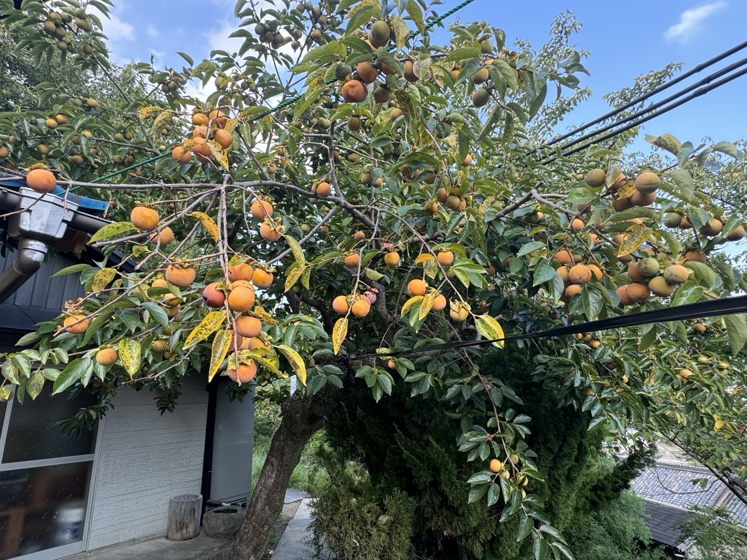 大阪事務所とコンテナハウスの間に大きく立つ柿の木です。